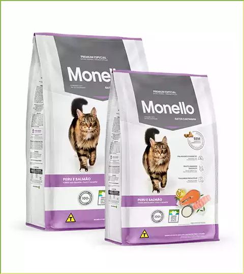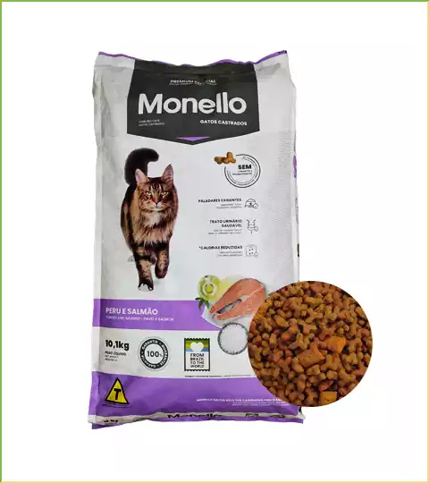 غذای خشک Monello Sterilised Turkey & Salmon گزینهای سالم و کامل برای کنترل وزن گربههای عقیم شده با طعم لذیذ بوقلمون و سالمون است: