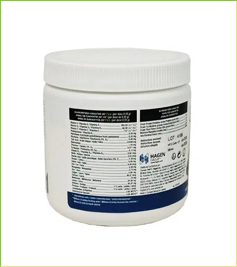ترکیبات | ویتامین A، ویتامین C، ویتامین D، ویتامین E، مواد معدنی، اسیدهای آمینه (لیزین و متیونین)، پروبیوتیکها، آنزیمها، اسید کنندهها، طعمدهنده میوههای اگزاتیک، گلوکونات کلسیم |